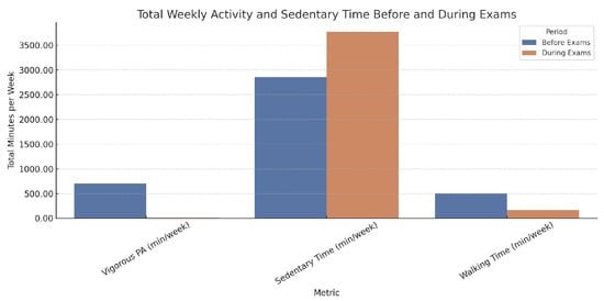 Figure 4. Total weekly minutes of vigorous physical activity, sedentary time, and walking before and during the exam period. The figure illustrates a significant decline in physical activity and walking, alongside a marked increase in sedentary behavior during exams. Data are based on calculated totals from self-reported frequency and duration.