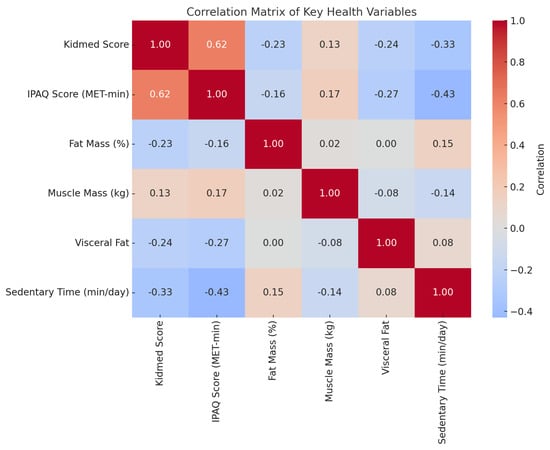 Figure 6 displays the correlation matrix of the main study variables. Higher adherence to the Mediterranean diet, as assessed by the Kidmed score, was positively correlated with physical activity levels (r = 0.62) and negatively correlated with sedentary time (r = −0.33), fat mass (r = −0.23), and visceral fat (r = −0.24). Similarly, IPAQ scores showed a strong negative association with sedentary behavior (r = −0.43) and moderate negative associations with fat mass and visceral fat. Notably, sedentary time was inversely correlated with both dietary quality and physical activity, reinforcing its role as a negative determinant of body composition.