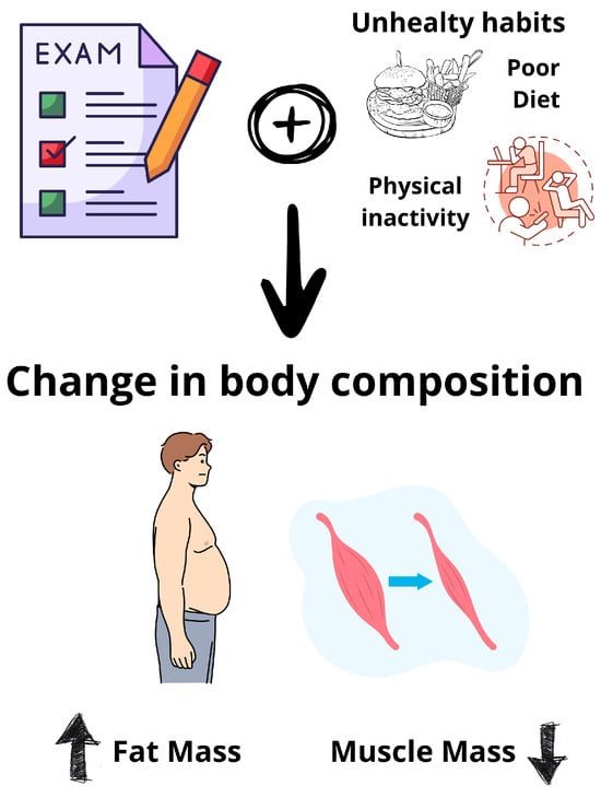 The previous literature supports the notion that academic stress during examination periods [14] and negatively impacts students’ lifestyles [15,16]. Increased academic demands often lead to disrupted routines, poorer eating habits [5], and a reduction in physical activity levels [17]. Students may skip meals, consume ultra-processed foods [7], or neglect regular exercise due to time constraints or psychological stress, which, over time, can adversely affect body composition [18] and overall health [19].