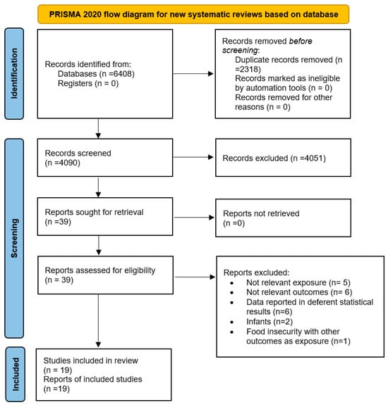 Our comprehensive search identified a total of 6408 articles. After removing duplicates, 4090 studies remained for evaluation (Figure 1). A title and abstract review led to the exclusion of 4051 articles. Subsequent full-text evaluation of the 39 remaining studies resulted in the exclusion of an additional 20 articles for the following reasons: six studies reported outcomes not relevant to our research scope, five did not focus on relevant exposures, five reported data using different statistical metrics, one focused on infants, and another examined FI as an outcome rather than as an exposure (Supplementary Table S3). Ultimately, 19 articles met our inclusion criteria and were included in the current study [18,19,20,21,22,23,24,25,26,27,28,29,30,32,33,42,43,44,45].