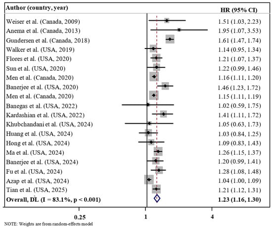 The overall analysis results suggested a significant relationship between FI and enhanced risk of mortality (HR = 1.23; 95% CI: 1.16, 1.30; I2 = 83.1%; p < 0.001; n = 19) (refer to Figure 2). A high degree of heterogeneity was detected in selected articles. Subgroup analysis according to the level of FI suggested that the risk of mortality increased with the magnitude of FI from mild (HR = 1.16; 95% CI: 1.10, 1.22; I2 = 0.0%; p < 0.001; n = 9), moderate (HR = 1.19; 95% CI: 1.07, 1.31; I2 = 83.2%; p = 0.001; n = 10), and severe (HR = 1.52; 95% CI: 1.25, 1.86; I2 = 94.9%; p < 0.001; n = 10) (Table 3). Subgroup analysis by cause of mortality demonstrated a significant relationship between FI and increased risk of all-cause mortality (HR = 1.26; 95% CI: 1.18–1.35; I2 = 82.0%; p < 0.001; n = 16) and cardiovascular-related mortality (HR = 1.24; 95% CI: 1.11–1.39; I2 = 42.8%; p < 0.001; n = 7), whereas no significant association was found for cancer-related mortality (HR = 1.04; 95% CI: 0.98–1.11; I2 = 94.9%; p = 0.236; n = 4). Subgroup analysis by geographic region showed a significant association between FI and mortality risk in studies conducted in Canada (HR = 1.19; 95% CI: 1.07–1.32; I2 = 82.0%; p = 0.001; n = 5), but not in those conducted in the United States (HR = 1.07; 95% CI: 0.93–1.25; I2 = 42.8%; p = 0.349; n = 14). Subgroup analysis by health status indicated that FI was significantly associated with mortality risk among the healthy population (HR = 1.25; 95% CI: 1.17–1.34; I2 = 85.5%; p < 0.001; n = 10), HIV/AIDS patients (HR = 1.63; 95% CI: 1.18–2.25; I2 = 0.0%; p = 0.003; n = 2), and other patient groups (HR = 1.30; 95% CI: 1.15–1.48; I2 = 0.0%; p < 0.001; n = 3), but not among cancer patients (HR = 1.04; 95% CI: 1.00–1.09; I2 = 0.0%; p = 0.535; n = 2) or cancer survivors (HR = 1.05; 95% CI: 0.89–1.23; I2 = 0.0%; p = 0.574; n = 2). However, subgroup analyses based on age at mortality, sample size, follow-up duration, mean age, FI assessment, COVID-19 pandemic period, and covariate adjustments did not yield significant differences between groups. Notably, stratification by FI severity, mean age, health status, and cause of mortality contributed to a reduction in observed heterogeneity across studies.