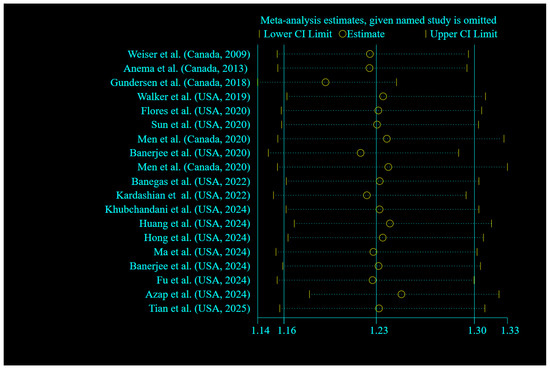 Forest plots showing sensitivity analysis results of the relationship between food insecurity and risk of mortality [18,19,20,21,22,23,24,25,26,27,28,29,30,33,35,45,46,47,48].