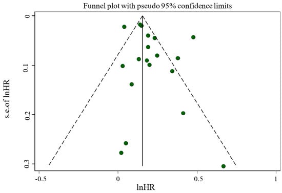 Sensitivity analysis across the highest to the lowest meta-analysis for FI revealed no significant influence in any single article (Figure 3). No evidence of publication bias was observed among studies related to the association of FI and mortality (p = 0.135, Egger’s test; p = 0.761, Begg’s). In addition, the funnel plot was symmetrical for the relationship between the FI and mortality (Figure 4).