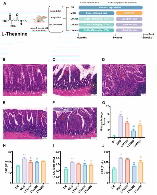 Numerous naturally active ingredients derived from plants, including L-theanine (LTA) [16], garlic fructans [17], and baicalin [18], have been extensively investigated for their potential to alleviate intestinal injury owing to their low toxicity. LTA is a unique amino acid found in tea that is easily absorbed by the intestine and considered safe [19,20]. LTA has a similar structure to glutamine and glutamate, and its biosynthesis is derived from glutamate. It has multiple biological functions, including antioxidant and anti-inflammatory functions [21,22]. In previous studies, our research team has demonstrated that LTA maintains homeostasis within the intestinal microbiome [16,23]. Additionally, our findings indicated that LTA plays a significant role in regulating alcohol metabolism [5]. However, whether LTA protects against chronic alcoholic intestinal injury and its underlying mechanisms remains unknown. Consequently, we established a model of chronic alcoholic intestinal injury in rats. Inflammatory factors, antioxidant enzyme activity, intestinal permeability, and histopathology were used to evaluate the effects of LTA on chronic alcoholic intestinal injury. 16S ribosomal RNA (16S rRNA) gene sequencing and non-targeted metabolomics were used to reveal potential mechanisms of action. These findings were further verified using quantitative real-time polymerase chain reaction (qPCR), Western blotting, and targeted metabolite analyses. This study aims to provide a new strategy for the protection and mitigation of chronic alcohol-induced intestinal injury and provide scientific support for developing LTA as a nutritional supplement.