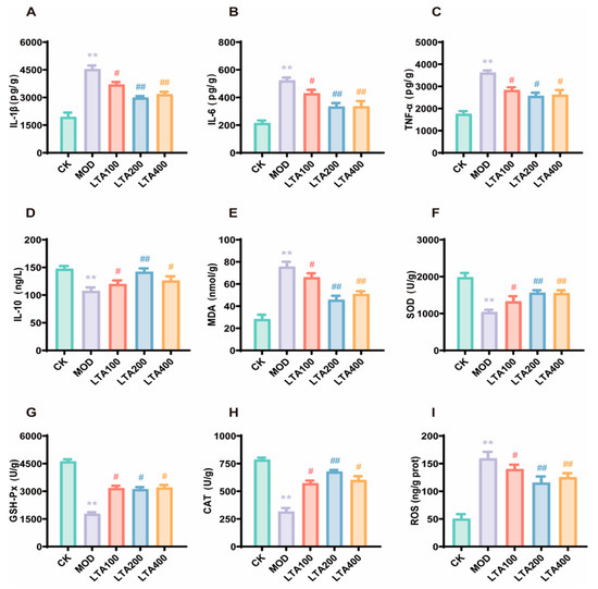 Effects of LTA on intestinal inflammatory factors and antioxidant capacity level in rats (n = 3). (A) interleukin-1β (IL-1β), (B) interleukin-6 (IL-6), (C) tumor necrosis factor-α (TNF-α), (D) interleukin-10 (IL-10), (E) malondialdehyde (MDA), (F) superoxide dismutase (SOD), (G) glutathione peroxidase-px (GSH-Px), (H) catalase (CAT), and (I) reactive oxygen species (ROS) levels. Compared with CK, **: p < 0.01; compared with MOD, #: p < 0.05, ##: p < 0.01. Data are presented as the mean ± SD.