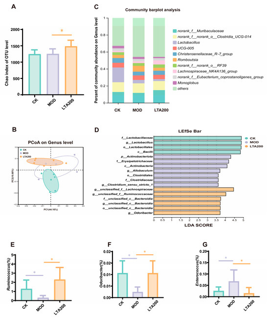 Effects of LTA on intestinal microbiota in rats (n = 6). (A) Chao index. (B) Principal component analysis (PCoA). (C) Genus-level community composition distribution. (D) LDA linear discriminant analysis. (E–G) The differences in microorganisms, including Ruminococcus, Odoribacter, and Enterococcus, between the CK, MOD, and LTA groups. Comparison between different groups, *: p < 0.05.