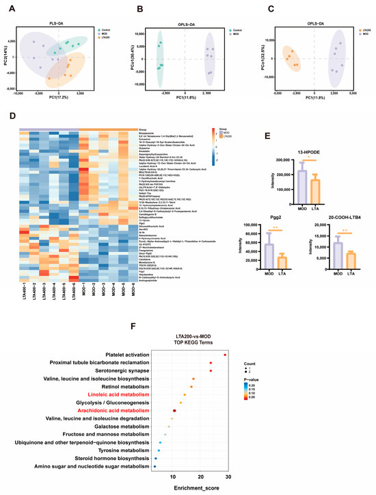 Effects of LTA on intestinal contents of metabolites in rats (n = 6). (A) Partial least squares discrimination analysis (PLS-DA) score plot. (B,C) Orthogonal partial least squares discrimination analysis (OPLS-DA) score plot. (D) Heat map of differential metabolite expression (LTA200 vs. MOD, TOP50). (E) Levels of three differential metabolites (PGG2, 13-HPODE, and 20-COOH-LTB4). (F) KEGG pathway classification (LTA200 vs. MOD). Comparison between different groups, *: p < 0.05, **: p < 0.01.