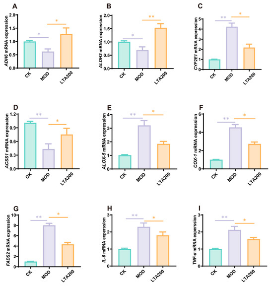 Effects of LTA on the expression of key mRNA in intestinal alcohol metabolism and LA-AA metabolism (n = 3). (A) ADH6. (B) ALDH2. (C) CYP2E1. (D) ACSS1. (E) ALOX-5. (F) COX-1. (G) FADS2. (H) IL-6. (I) TNF-α. Comparison between different groups, *: p < 0.05, **: p < 0.01.