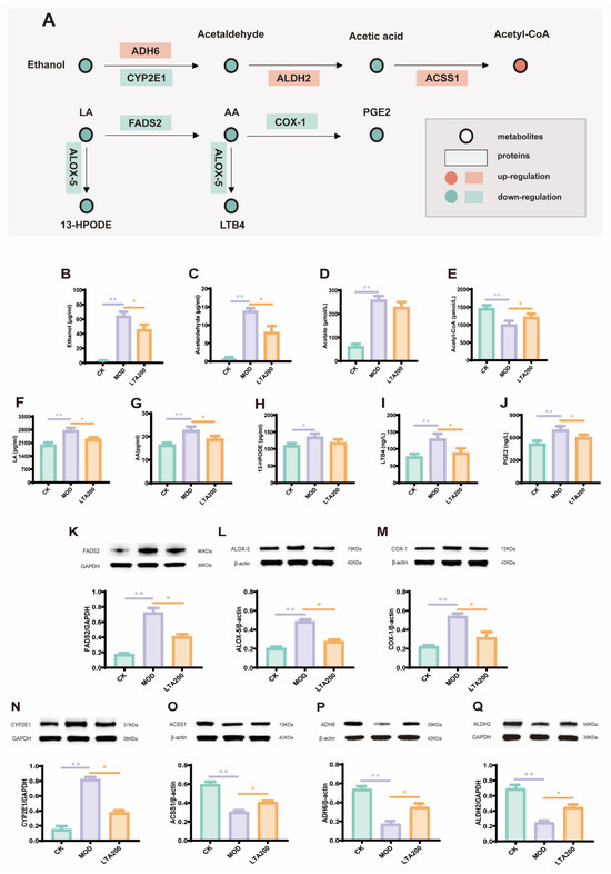 The levels of metabolites and proteins associated with alcohol metabolism as well as those related to the LA-AA metabolic pathway were further analyzed. The results of metabolite detection indicated that, compared with those in the CK group, the MOD group exhibited significantly elevated levels of ethanol, acetaldehyde, acetic acid, LA, AA, PGE2, 13-HPODE, and LTB4 (Figure 6B–D,F–J, p < 0.01), whereas acetyl-CoA levels were significantly reduced (Figure 6E, p < 0.01). Unlike the MOD group, the LTA200 group demonstrated a significant decrease in the levels of ethanol, acetaldehyde, LA, AA, PGE2, 13-HPODE, and LTB4 (p < 0.01), along with a significant increase in acetyl-CoA levels (p < 0.01). Notably, acetic acid content did not change significantly in the LTA200 and MOD groups.