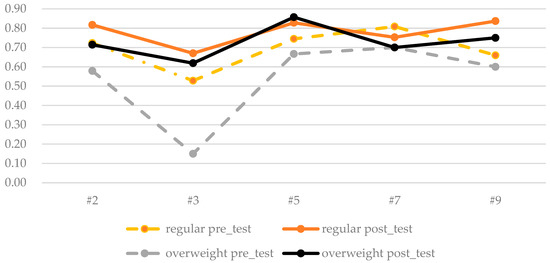 To examine the situation of the students with overweight, some items that connected the concept for food, nutrition, behavior, and diabetes were taken out for additional analysis. Graphs were plotted for the mean correction rate for the pre- and posttests for regular and overweight subjects. The items taken for comparisons are listed in Table 5, and the pre-test and posttest means are depicted in Figure 2.