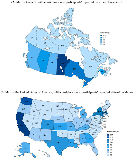 Heat maps of participants’ reported provinces (A) and states (B) of residence. Maps created using mapchart.net.
