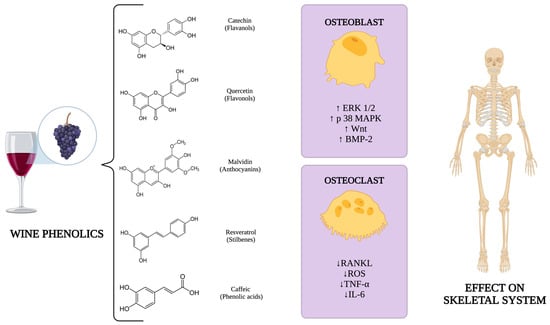 Molecular mechanisms related to wine phenolics on the skeletal system. Created with https://www.biorender.com/. Abbreviations: ERK 1/2: extracellular signal-regulated kinase 1/2; p38 MAPK: p38 mitogen-activated protein kinase; Wnt: Wnt signaling pathway; BMP-2: bone morphogenetic protein 2; RANKL: receptor activator of nuclear factor-κB ligand; ROS: reactive oxygen species; TNF–α: tumor necrosis factor alpha; IL–6: interleukin 6.
