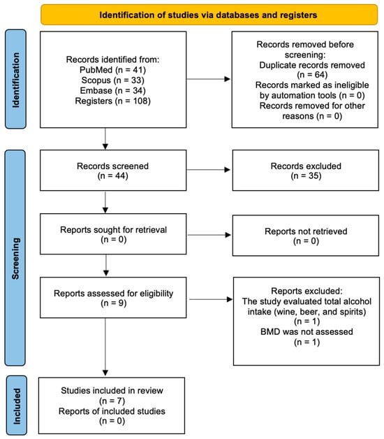 A total of 108 studies were identified across the previously selected electronic databases: 41 from PubMed, 33 from Scopus, and 44 from Embase. After removing 64 duplicates, 44 articles remained for title and abstract screening, and 9 were selected for a full-text assessment. Of these, 2 studies were manually excluded for not meeting the inclusion criteria: Mukamal et al. 2007 [] evaluated total alcohol intake (including wine, beer, and spirits), and Pedrera-Zamorano et al. 2009 [] did not assess BMD. Therefore, 7 studies were included in the final analysis. Details of the search strategy and selection process are illustrated in Figure 2.