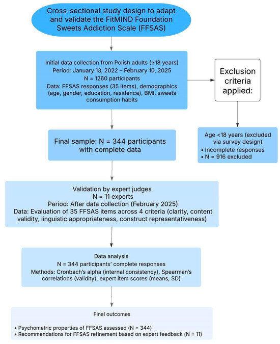 Between 13 January 2022, and 10 February 2025, a total of 1260 Polish adults (aged ≥ 18 years) volunteered to participate in the study by completing the online FFSAS questionnaire via Google Forms. Of these, 916 participants were excluded due to incomplete responses (e.g., missing FFSAS items or demographic data). The study workflow along with the process of participant recruitment is demonstrated in Figure 1.