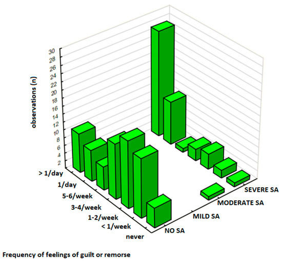 Similarly, the frequency of negative emotions was significantly higher in participants with SA compared to those with No SA (Table 5). In this subgroup (N = 126), 30% (n = 38) responders experienced feelings of remorse, guilt, shame, or anger ‘several times a day,’ including 21% (n = 27) in the Severe SA group and 8% (n = 10) in the No SA group (Figure 3). Statistical analysis revealed a strong association between SA severity and the frequency of experiencing negative emotions (p = 0.00001) and a moderate-to-strong correlation between these variables (p < 0.001).