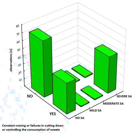 Sweets consumption frequency was assessed in the total sample of 344 participants (Table 3), in which 62% (n = 213) were classified as No SA, 1% (n = 4) as Mild SA, 1% (n = 4) as Moderate SA, and 36% (n = 123) as Severe SA. Participants with Severe SA had significantly higher consumption rates of sweet foods, with 19% (n = 66) reporting eating sweets ‘several times a day’ compared to 12% (n = 40) in the No SA group. In this group, there was a strong association between sweet food consumption frequency and SA severity (χ2 = 85.23, df = 15, p < 0.00001).