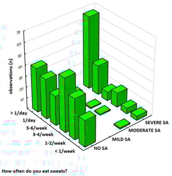 3.2.3. Sweets Consumption Frequency and SA Severity