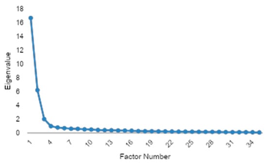 To evaluate the structure of the FFSAS and ensure its psychometric properties, an EFA was conducted. Briefly, the applied Kaiser–Meyer–Olkin measure (KMO = 0.956) demonstrated excellent sampling adequacy, and Bartlett’s test of sphericity was highly significant (p < 0.001), confirming robust inter-item correlations and validating the dataset’s suitability for factor analysis. The number of factors was determined via the scree plot elbow criterion, which indicated a three-factor solution as the optimal point where eigenvalues began to level off sharply after the third component (Figure 6). The communality analysis revealed a high average communality of 0.686, with no variables below the 0.4 threshold and only one variable falling below 0.5, indicating that nearly all items were well-represented by the extracted factors.