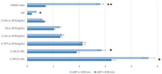 Key cardiovascular risk markers, including C-TOT/C-HDL, C-LDL/C-HDL and Atherogenic Index of Plasma (AIP), were significantly different between groups (p = 0.03; 0.04; 0.02, respectively). There were no statistical differences between the groups’ C-LDL and TG levels. The HOMA Index was statistically significantly higher in the cIMT > 0.90 mm group compared to the other group.