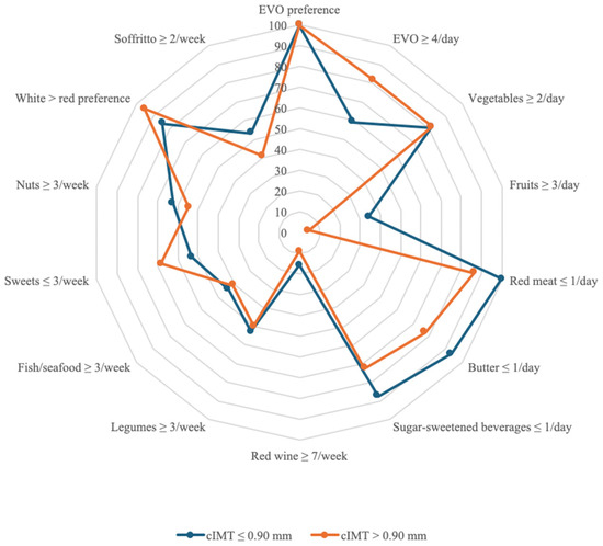 Answers and scoring of the MEDAS. The “YES” answer to the MEDAS items is compared between the sample with cIMT ≤ 0.90 mm and the group with cIMT > 0.90 mm. The radar chart shows for each MEDAS score item the affirmative responses of the sample with cIMT ≤ 0.90 mm compared to the group with cIMT > 0.90 mm with separate axes starting from the center of the draft (0% “YES” responses) and at the end of the last circle (100% “YES” responses). Values are in percentages. Abbreviations: EVO, extra virgin olive oil; cIMT, carotid intima-media thickness.