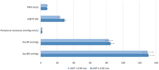 Finally, the mean cIMT was within the normal range, averaging 0.80 mm. All of these parameters are reported in Table A2 (Appendix A).