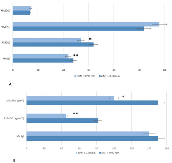 Bioimpedentiometric (A) and ecocardiographic (B) parameters stratified by carotid intima-media thickness (cIMT). Wilcoxon rank sum test; Fisher’s exact test; Pearson’s Chi-squared test was performed for statistical analysis. p < 0.5 *; p < 0.01 **. Abbreviation: BSA, body surface area; FFM, Fat-Free Mass; FM, fat mass; LVM, left ventricular mass.