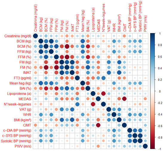 Matrix correlations. Abbreviations: BAI, Body Adiposity Index; BCM, Body Cell Mass; BMI, Body Mass Index; c-DIA BP, Central Diastolic Blood Pressure; c-SYS BP, Central Systolic Blood Pressure; CIMT, Carotid Intima-Media Thickness; FFM, Fat-Free Mass; FM, Fat Mass; FT3, Triiodothyronine; IMAT, Intramuscular Adipose Tissue; MEDAS, Mediterranean Diet Adherence Screener; PWV, Pulse Wave Velocity; Systolic BP, Systolic Blood Pressure; VAT, Visceral Adipose Tissue; WHR, Waist-to-Height ratio.