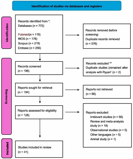 Figure 1. PRISMA flow diagram adapted from Page et al. [14] of the study selection process. * A total of 772 records were identified through database searching. ** After removing duplicates and applying eligibility criteria, 41 studies were included in the final review.