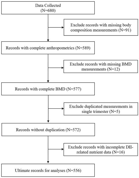 Consequently, 556 participants met eligibility requirements (Figure 1) and completed the following assessments, including semi-quantitative food frequency questionnaires (FFQ), BMD, and body composition evaluations during the first, second, and third trimesters. Trained researchers informed the participants about the objectives of the investigation, provided fundamental details about the study, and obtained individual informed consent. Precise, visual, scaled, and weighted food safeguards were employed to mitigate the recall bias of self-reported dietary data. Ethical approval for the study protocol was obtained from the Medical Ethics Committee of Peking University.