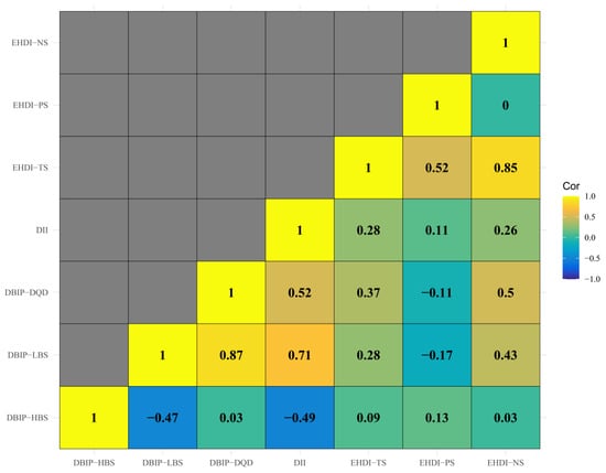 Correlation Matrix of Dietary Assessment Indices. Note: The heatmap illustrates Spearman’s correlation coefficients between the three dietary indices. DII shows strong correlations with DBIP-LBS, suggesting shared measurement of dietary assessment. Moderate correlations between DBIP-DQD, DII and EHDI-TS highlight distinct dietary aspects.