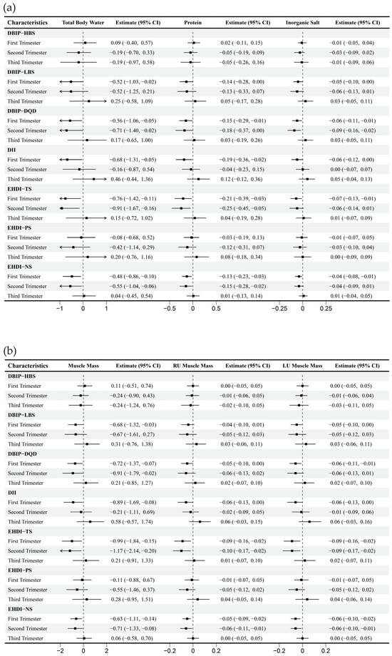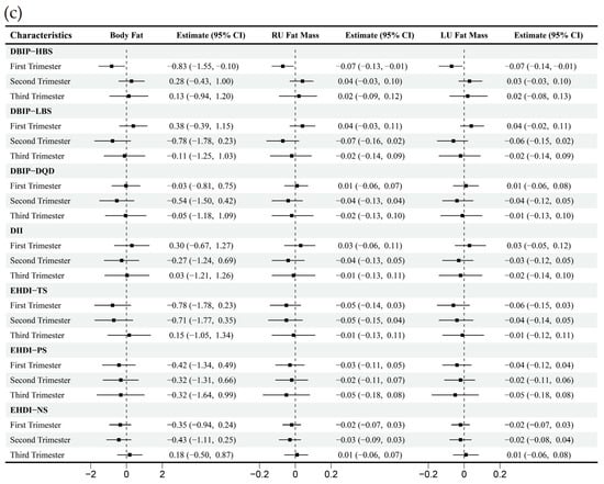 Multiple linear regression between dietary indices and body composition across trimesters. Note: Adjusted for age, gender, pre-pregnancy body mass index, education, income, gestational diabetes mellitus (GDM), light physical activity frequency and time, and sun exposure time. (a–c) Represents trimester-stratified regression results for associations between dietary indices and selected body composition parameters (encompassing fluid balance, muscle, and fat mass; full relevant associations are available in the Appendix A).