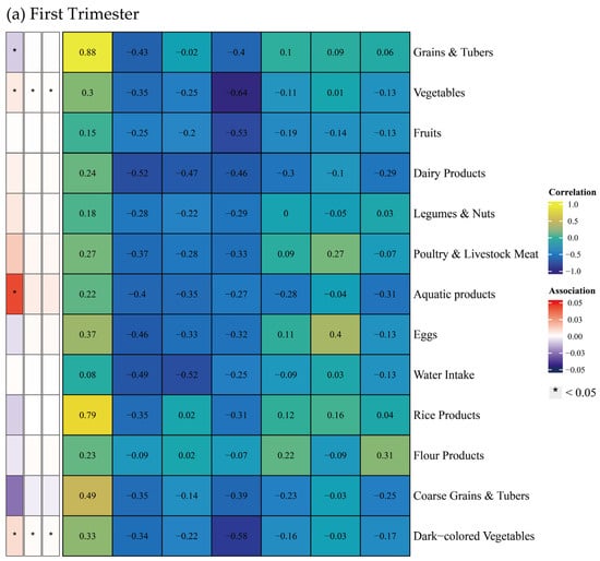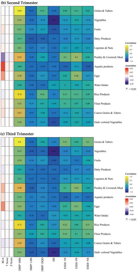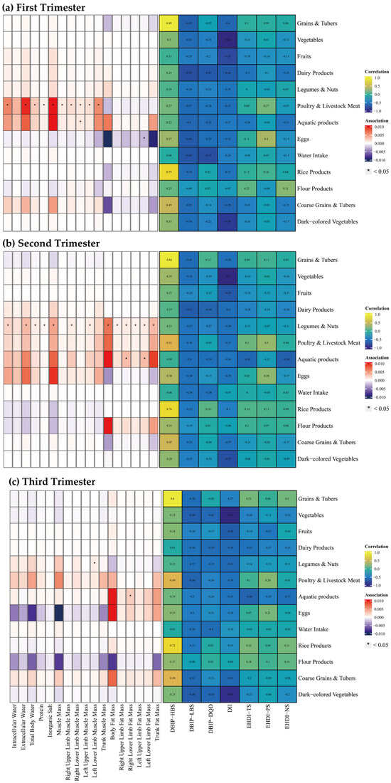 During the first trimester, poultry and livestock meat intake was positively correlated with water intake, protein, inorganic salt, and muscle mass. Similarly, aquatic product intake was positively correlated with left upper limb muscle mass, whereas egg consumption was inversely correlated with left lower limb muscle mass. In the second trimester, intake of legumes and nuts indicated widespread positive correlations with body composition parameters. Aquatic product consumption was linked to increase in bilateral lower limb fat mass. During the third trimester, legumes and nuts intake was positively correlated with left lower limb muscle mass, while aquatic product intake was correlated with elevated right lower limb fat mass.