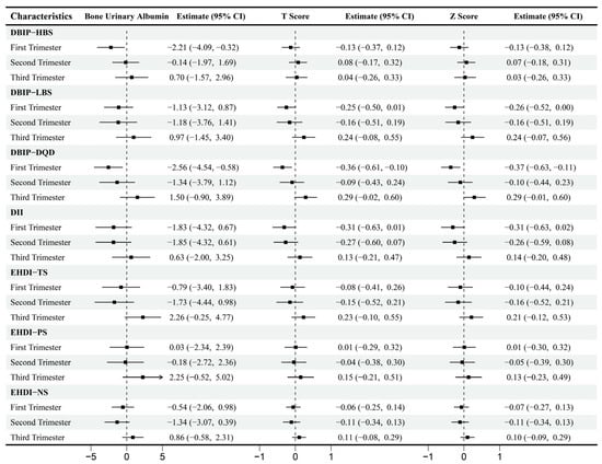Multivariable-adjusted correlations between dietary indices and BMD are presented in Figure 5. During the first trimester, HBS exhibited a significant negative correlation with BUA (β = −2.21, 95% CI [−4.09, −0.32]), while LBS negatively correlated with Z-score (β = −0.26, 95% CI [−0.52, 0.00]). DQD demonstrated a negative correlation with BUA (β = −2.56, 95% CI [−4.54, −0.58]), T-score (β = −0.36, 95% CI [−0.61, −0.10]) and Z-score (β = −0.37, 95% CI [−0.63, −0.11]). No significant correlations were observed between dietary indices and BMD during the second or third trimesters.