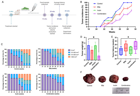 Combinatorial dietary administration of BSp and/or inulin suppressed the mammary tumor development in Her2/neu mice. (A) Schematic representation of the experimental design. Dietary treatment initiated from weaning to the termination point of this experiment. (B) Tumor incidence, (C) tumor volume, (D) tumor weight (measured at the termination point), (E) tumor latency, and (F) representative images of the excised tumors recorded at the termination point. Columns, mean; Bars, SEM; *, p < 0.05, combinatorial group §, p < 0.05, BSP group. n = 10.