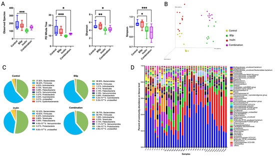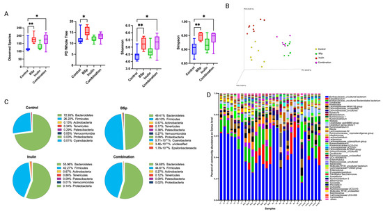 The generated FASTQ files were assessed for quality control using FastQC and library construction. The processed library was used for Quantitative Insight into Microbial Ecology (QIIME) analysis [27]. DADA2, a pipeline that filters out low abundance sequences due to polymerase chain reaction or sequencing errors, was used to cluster sequences into amplicon sequence variants (ASV) and assign taxonomies [28,29]. Multiple sequence alignment of ASVs was generated by PyNAST [29,30]. Alpha diversity was calculated with observed species (measuring richness only), PD whole tree (including phylogeny), Shannon, and Simpson indices. Beta diversity was calculated using the Bray–Curtis and weighted UniFrac methods to quantify dissimilarity between treatment groups (BSp, IN, and Combination) and the control group [17,24].