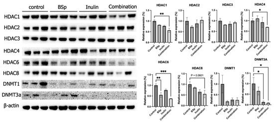 Protein expression of key epigenetic modification-related factors in the mammary tumors from the BSp, inulin, combination, and control groups. Western blotting was performed to quantify the protein expressions of Hdac1, Hdac2, Hdac3, Hdac4, Hdac6, Hdac8, Dnmt3a, and Dnmt1 in the mammary tumor samples of the dietary treatment groups and the control group. β-actin was used as the loading control. Column, mean; error bars, SEM; *, p < 0.05; **, p < 0.01; ***, p < 0.001, significantly different from the control group. n = 3, biological replicates.