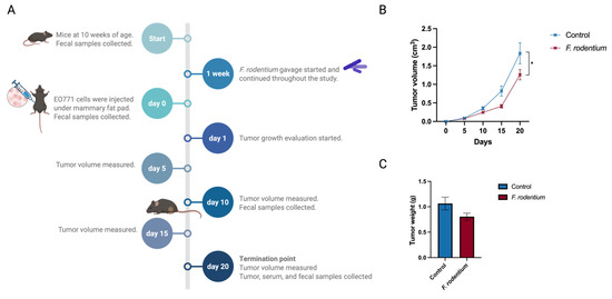 Oral administration of Faecalibaculum rodentium delayed the mammary tumor development in an EO771 syngeneic mouse model: (A) Schematic representation of the experimental design. (B) Tumor volume. (C) Tumor weight was evaluated. Columns, mean; bars, SEM; *, p < 0.05. n = 15.