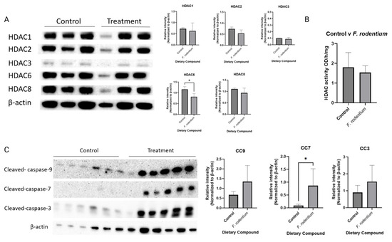 Protein expression of key epigenetic regulators HDACs and key factors in the intrinsic apoptosis pathway in the mammary tumors from the F. rodentium and control groups. Western blotting was performed to quantify the protein expressions of (A) HDAC1, HDAC2, HDAC3, HDAC6, and HDAC8, n = 3. (B) cleaved-caspase-3, cleaved caspase-7, and cleaved-caspase-9 in the mammary tumor samples. β-actin was used as the loading control. (C) Cleaved-caspase-9, cleaved-caspase-7, and cleaved-caspase-3, n = 6. Column, mean; error bars, SEM; *, p < 0.05, significantly different from the control group. n = 3 or 6, biological replicates.
