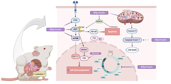 Hypothetical schematic representation of the mechanism of action for BC prevention in combinatorial diet-fed mice. A proposed mechanism illustrating the anticancer effect of the BSp and IN combinatorial dietary intervention. The combinatorial treatment induced changes in gut microbial composition, enhanced protective epigenetic modifications, inhibited the PI3K/AKT/mTOR and cell cycle signaling pathways, and promoted intrinsic apoptosis in the mammary tumors of the ER-negative BC mouse model. Upward arrows indicate activation, dashed arrows indicate indirect effects, and T-bar arrows indicate inhibition.