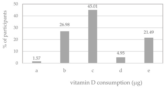 The method used to analyze the answers entered by the study participants in the questionnaire is as follows: (1) the total number of servings was divided per seven or per 30 days, in the case of products specified weekly or monthly; (2) the vitamin D intake from each product was estimated using the following equation: vitamin D intake (μg) = daily number of servings × typical vitamin D content in 1 serving; (3) the total daily dietary vitamin D intake was obtained as the sum of the vitamin D intake values from all the analyzed groups of products.