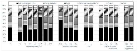 The procedure used allowed the calculation of the total vitamin D intake from the diet, as well as the vitamin D intake from specific groups of products (GR), including (1) fish and fish products (F/FP: F/FP_GR1: salmon, rainbow trout, herring, eel; F/FP_GR2: halibut, mackerel, brook trout, sole, tuna; F/FP_GR3: cod, flounder, plaice, pollock, hake; F/FP_GR4: herring, sardine, and tuna products; F/FP_GR5: other fish products); (2) dairy products; (3) eggs; (4) meat and meat products; (5) cereals; and (6) fats [35].