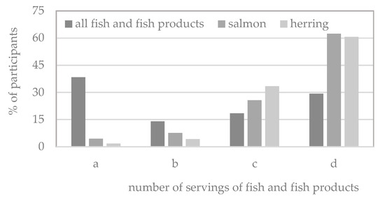 The median intake of F/FP amounted to 2.10 servings per week, ranging from 0.93 to 50.63 per week. The highest number of servings was reported for F/FP_GR1, including salmon, rainbow trout, herring, and eel (0.23 servings per week). For the other food groups, the consumption of cereals and dairy products was higher (about three servings per day each).
