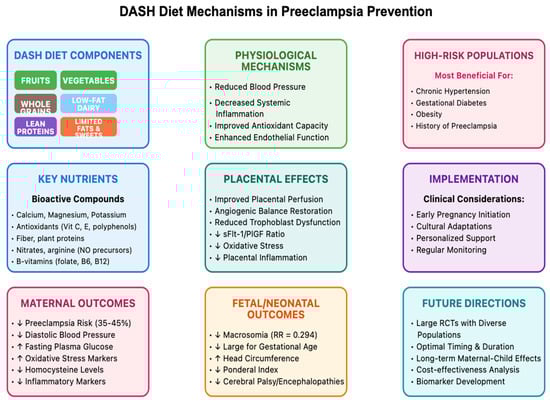 Another dietary pattern that has gained significant attention for its cardiovascular benefits and potential role in preeclampsia prevention is the Dietary Approaches to Stop Hypertension (DASH) diet. The DASH diet was originally developed in the 1990s as a dietary intervention specifically designed to reduce blood pressure [27,28]. Given that hypertension is a defining feature of preeclampsia, and considering the shared pathophysiological mechanisms between chronic hypertension and preeclampsia (including endothelial dysfunction, oxidative stress, and inflammation) [7,11,16], the DASH diet has emerged as a promising approach for preeclampsia prevention.