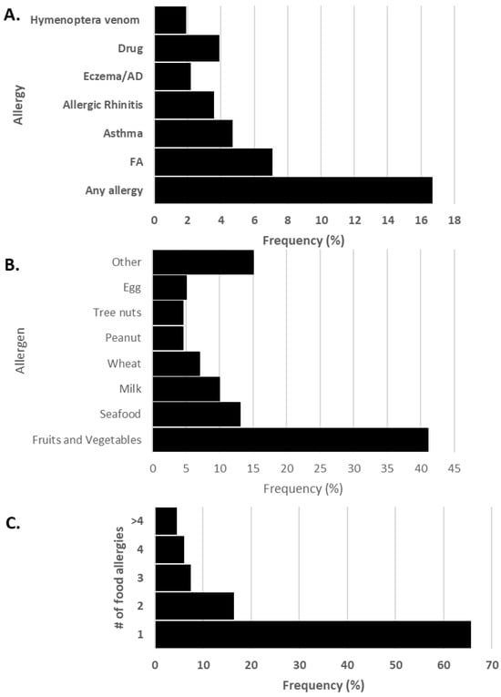 - Patel, G.B.; Kellner, E.S.; Clayton, E.; Chhiba, K.D.; Alakija, O.; Bryce, P.J.; Wechsler, J.B.; Singh, A.M. Quality of life is lower in adults labeled with childhood-onset food allergy than in those with adult-onset food allergy. Ann. Allergy Asthma Amp Immunol. 2022, 127, 70. [Google Scholar] [CrossRef]