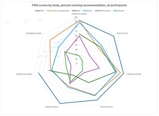 Participants from all cohorts resided in Western countries, and a large majority in all cohorts met the criterion for meat consumption (2–3 times/week, Figure 1 and Figure 2). A majority did not meet the criteria for snacks and packaged foods. There was more variation for the other factors. The fruit and vegetable criterion was met by almost all participants in ALSWH (93%) and a large majority (>75%) of CARDIA, PRESTO, and CePAWHS participants but by fewer participants in BHS and HCHS/SOL (50–55%). The dairy criterion was met for almost all ALSWH participants but lower proportions of BHS, HCHS/SOL, PRESTO, and CePAWHS women (56–61%). The percentage of participants adhering to recommendations for fish consumption ranged from 28% (HCHS) to 67% (PRESTO). Adherence to recommendations for consumption of whole grains varied but was in the middle 50% for almost all cohorts (range: 22% for CTS to 64% for ALSWH).