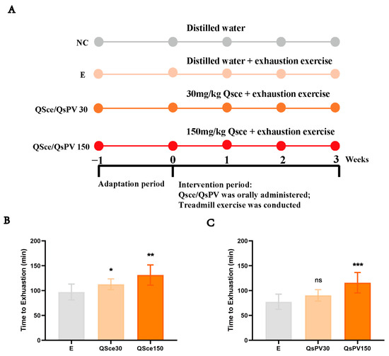 Effect of QS crude extract on time to exhaustion in mice. (A) The exhaustion exercise protocol, with mice receiving QSce (30 or 150 mg/kg/d) or QsPV (30 and 150 mg/kg/d). (B,C) Time to exhaustion in mice undergoing the 21-day exercise exhaustion protocol with 30 or 150 (mg/kg/d) dose QSce and QsPV. All values are expressed as means ± SEM. (n = 8. * p < 0.05, ** p < 0.01, *** p < 0.001).