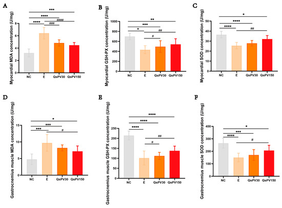 Levels of oxidative stress and anti-oxidant markers in myocardial muscle and gastrocnemius muscle from mice after the three-week exercise exhaustion protocol. Levels of oxidative stress and anti-oxidant markers in (A–C) myocardial muscle and (D–F) gastrocnemius muscle from mice after the three-week exercise exhaustion protocol. All values are expressed as means ± SEM. (* p < 0.05, ** p < 0.001, *** p < 0.005, **** p < 0.0001, NC vs. E and QsPVs; # p < 0.05, ## p < 0.01, ### p < 0.005, #### p < 0.0001, E vs. QsPVs).