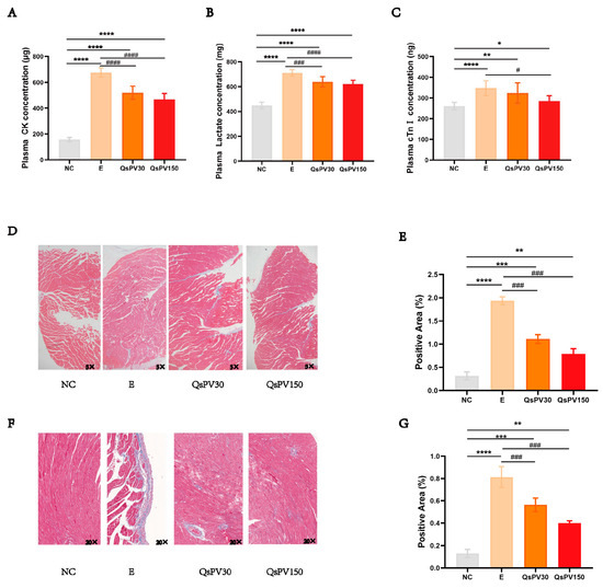 Serum injury biomarkers and fibrotic outcomes in skeletal muscle and myocardium. (A–C) Serum levels of injury biomarkers in mice after 3-week training: (A) Creatine kinase (CK), (B) Lactate dehydrogenase (LDH), (C) Cardiac troponin I (cTnI). (D–G) Masson’s trichrome staining of gastrocnemius and myocardial tissues in mice after 3-week training: (D) Representative micrographs of gastrocnemius Masson staining, (E) Percentage of positively stained area in gastrocnemius, (F) Representative micrographs of cardiac Masson staining, (G) Percentage of positively stained area in cardiac tissue. All values are expressed as means ± SEM. (* p < 0.05, ** p < 0.001, *** p < 0.005, **** p < 0.0001, NC vs. E and QsPVs; # p < 0.05, ### p < 0.001, #### p < 0.0001, E vs. QsPVs. n = 8).