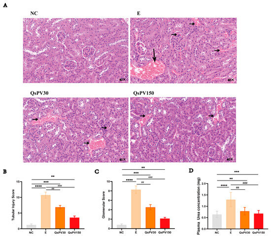 Renal injury with exhaustive exercise is recovered with QsPVs supplementation. (A) Pathological examination of HE-stained mouse kidney sections (5×). Arrows indicate glomerular and tubular lesions. (B) Renal tubular score. (C) Glomerular score. (D) Concentration of urea in mouse peripheral blood plasma (mg) in mice. All values are expressed as means ± SEM. (** p < 0.001, *** p < 0.005, **** p < 0.0001, NC vs. E and QsPVs; ## p < 0.05, ### p < 0.005, E vs. QsPVs, n = 8).