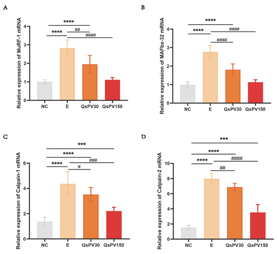 Expression analysis of genes associated with skeletal muscle atrophy in mice. (A,B) MAFbx-32 and MuRF-1 mRNA expression in skeletal muscle; (C,D) Calpain1/2 mRNA expression in skeletal muscle. All values are expressed as means ± SEM. (*** p < 0.005, **** p < 0.0001, NC vs. E and QsPVs; # p < 0.01, ## p <0.05, ### p < 0.001, #### p <0.0001, E vs. QsPVs, n = 8).